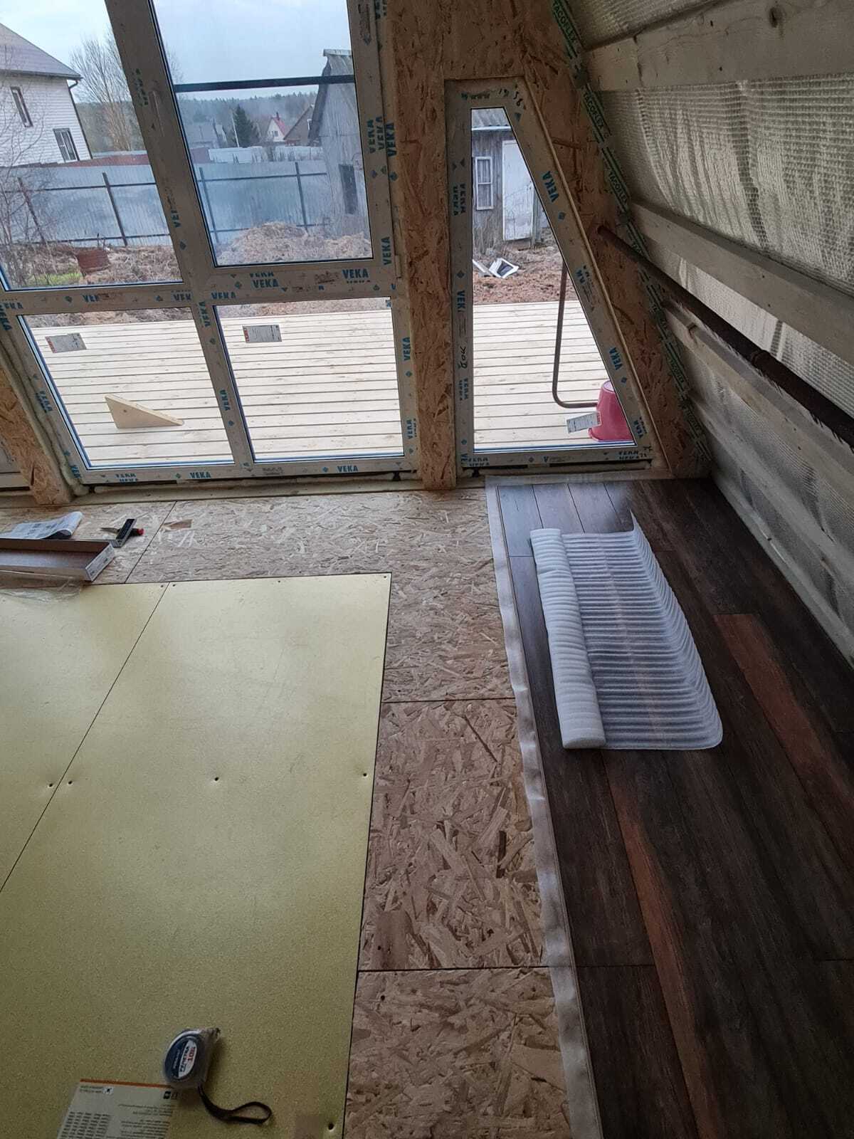 Панель имеет высоту 15 мм. Выравниваем уровень пола листами ОСБ или ДСП