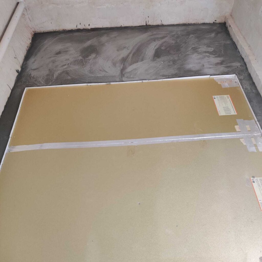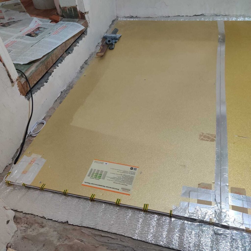 Панели Хотпанел установлены на ровном черновом деревянном полу. Со всех сторон от панелей Хотпанел пол подняли на 15 мм самонивелирующейся смесью.