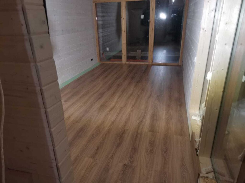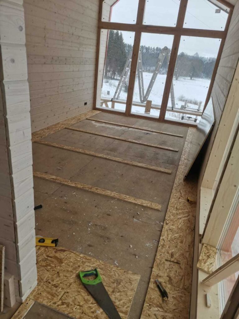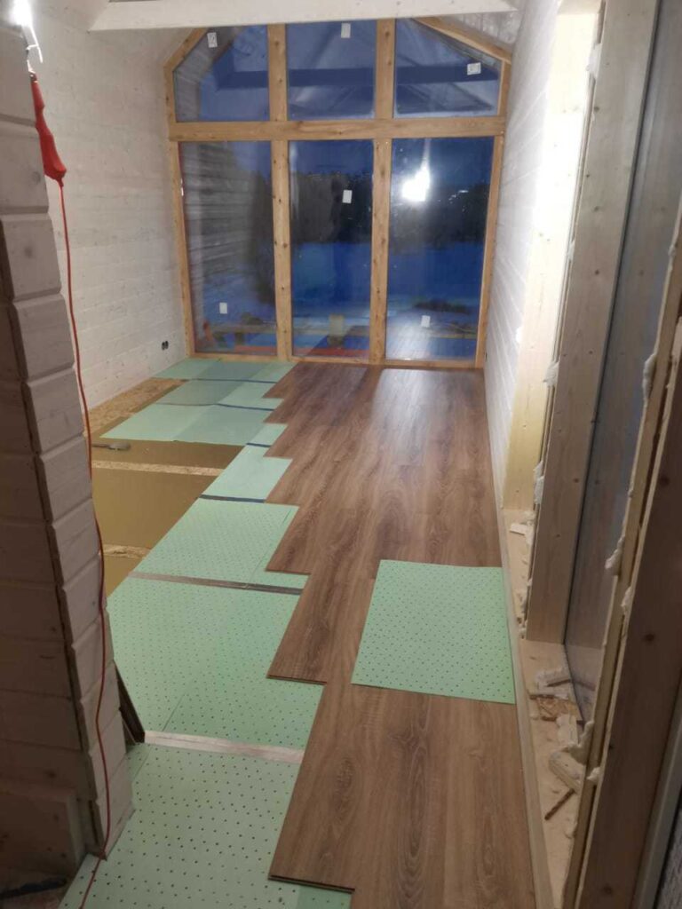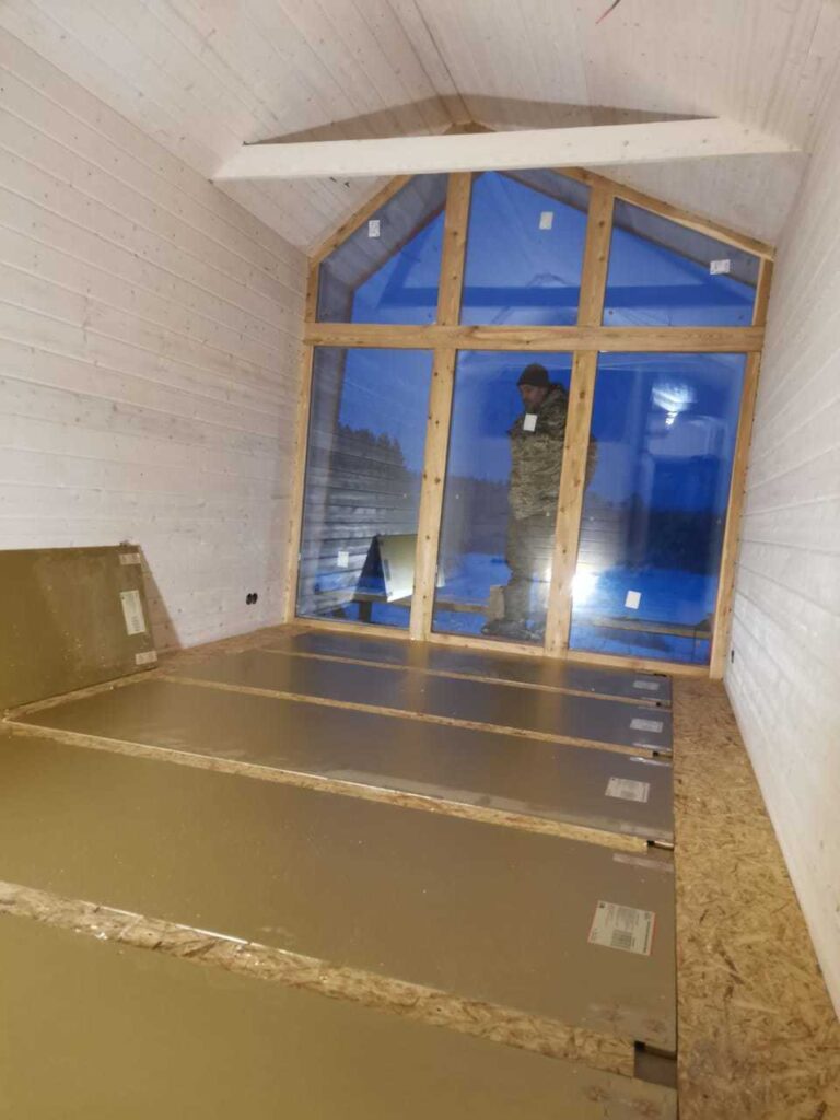 Пример укладки электрических панелей Хотпанел в гостевом каркасном доме. В качестве финишного напольного покрытия ламинат. Дом находится в Можайском районе Московской области. Для основного отопления, панелями Хотпанел заложено 60% площади пола.
