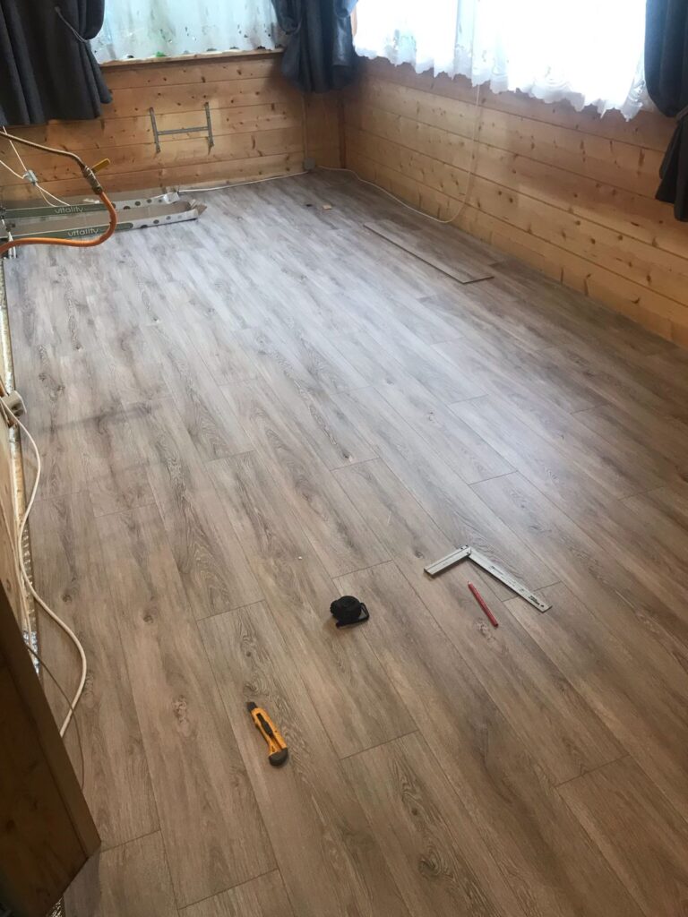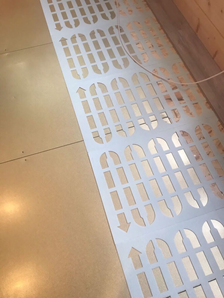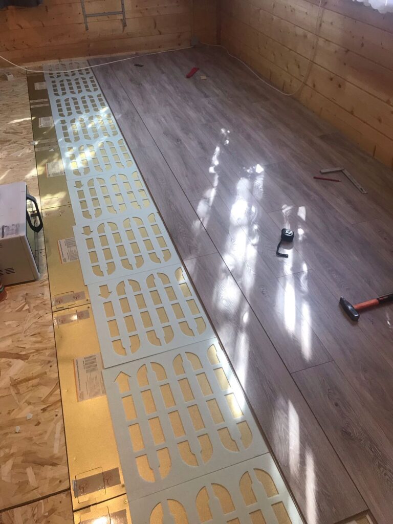 Теплый пол / электрические нагревательные панели «Хотпанел» в качестве основного отопления в деревянном доме. На фото идет процесс укладки ламината. На черновой пол укладываются электрические панели Хотпанел. Уровень пола вокруг панелей поднимается на 15 мм листами ОСБ3, ДСП, Фанерой или фальшпанелями.