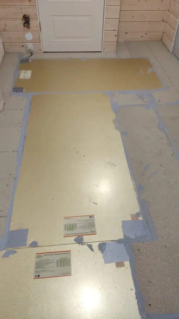 Пример укладки электрических панелей Хотпанел в прихожей деревянного брусового дома. В качестве финишного напольного покрытия планируется линолеум. Дом находится в Ленинградской области области.