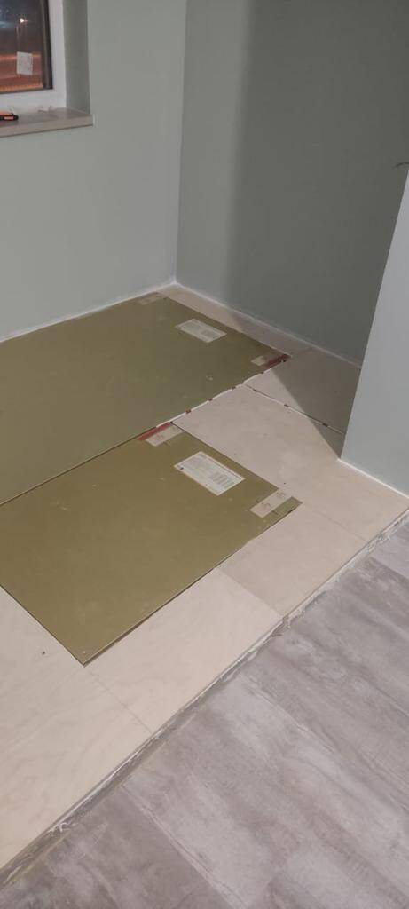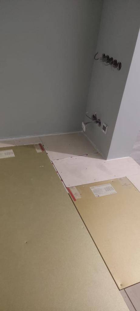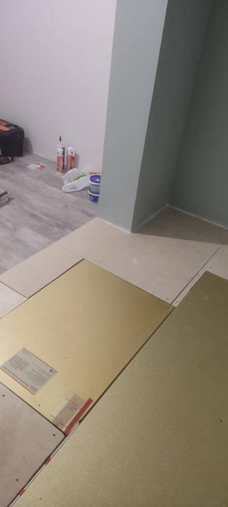 На представленных фото, панели показаны без финишного напольного покрытия. В качестве финишного напольного покрытия может использоваться ламинат, замковой кварц винил, линолеум, керамогранит. Уровень пола подняли на 15 мм с помощью фанеры.
