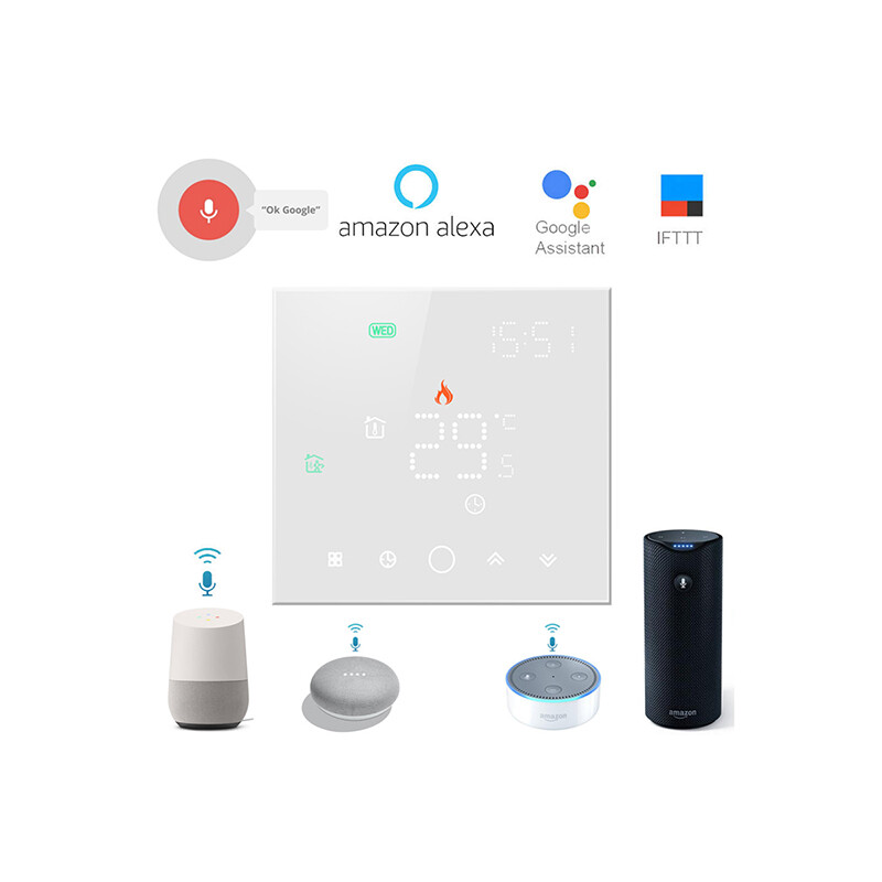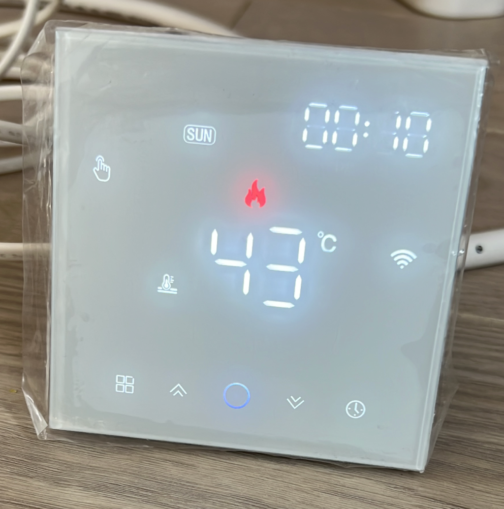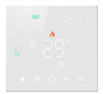 Программируемый терморегулятор с WIFI имеет на передней панели дисплей и пять кнопок управления. Данные тепрературы на экране покажут вам текущую температуру и влажность в помещении, с его помощью вы можете выбрать и настроить нужный режим как на самом термостате, так и дистанционно со смартфона. Все языки настроек синхронизируются под ваш часовой пояс, адрес, язык.